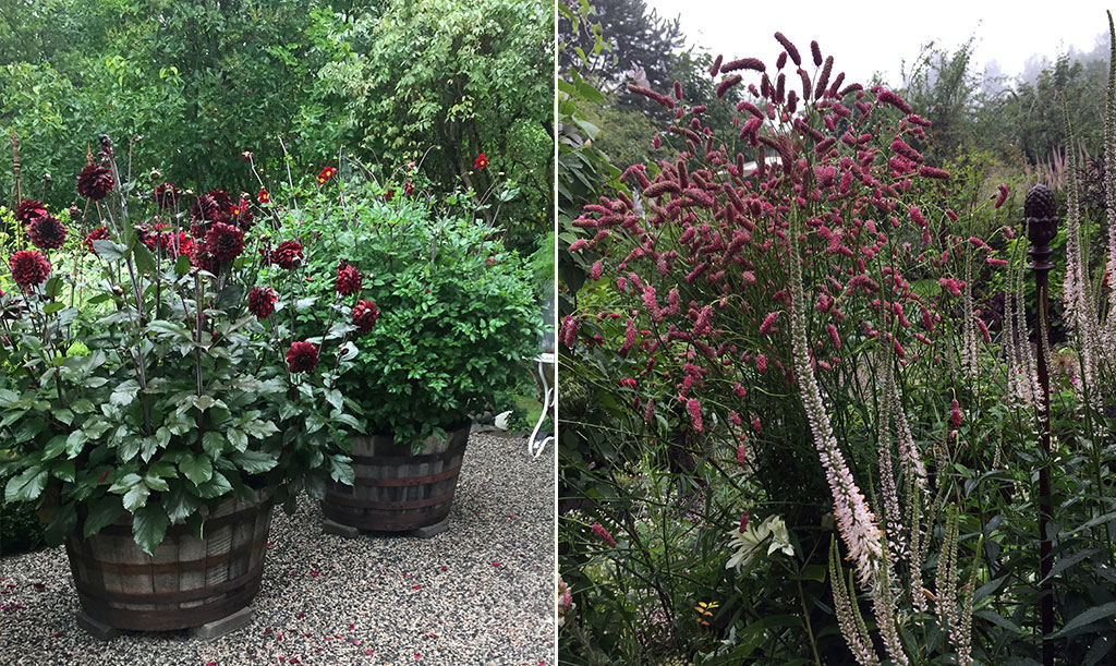 En enhetlig färgskala i trädgården skapar harmoni. I trätunnor växer praktfulla, mörkröda dahlior. I rabatten är blodtopp och kransveronika en lyckad kombination. Foto: Ulf Fransson, Nelson Garden