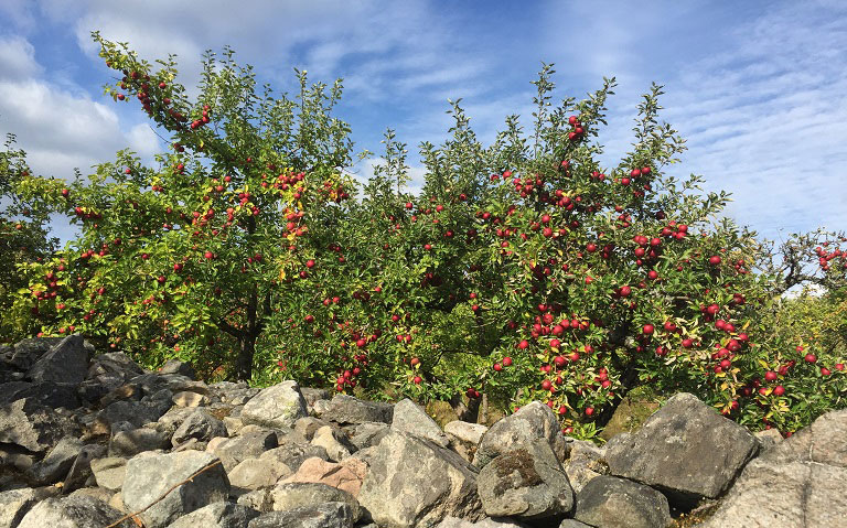 Vinteräpplen är så vackra! På bilden äppelträd från en underbar ängsäppelodling som ligger i Urshult, Småland. Närbild på de fantastiskt fina äpplena hittar du överst i inlägget. Foto: Kristina Niesel, Nelson Garden.