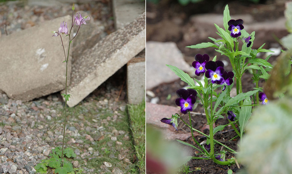Aklejor och penséer självsår sig lätt och är uppenbarligen inte kräsna vid val av växtplats! Foto: Lovisa Back, Nelson Garden