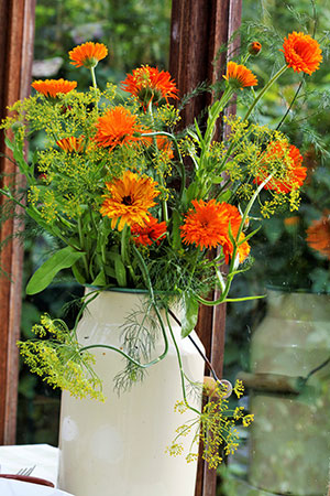 Dillkronor och ringblomma blir en festlig bukett på kräftskivan. Läs mer om ätbara buketter här. Foto: Annika Christensen för Nelson Garden.