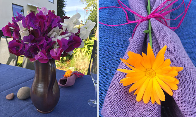 Att duka med egna blommor från balkongen eller trädgården är roligt och okomplicerat. Med några enkla ringblommor, färgglada band och en bukett av luktärter når dukningen nya höjder.