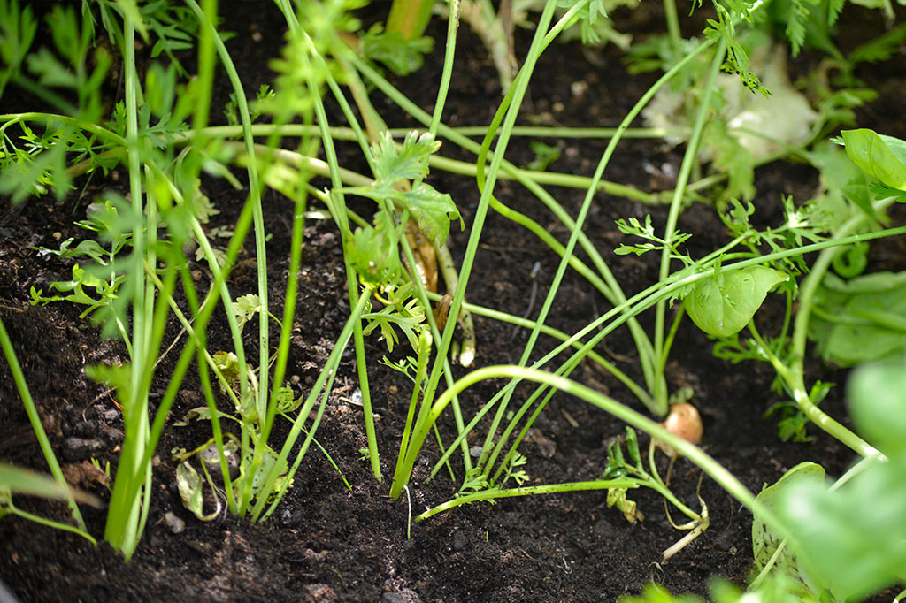 Glöm inte att mycket av det vi gallrar faktiskt kan hamna på middagsbordet! Morotsblast och blad från rädisor och rödbetor går utmärkt att äta och är särskilt goda när de fortfarande är små.