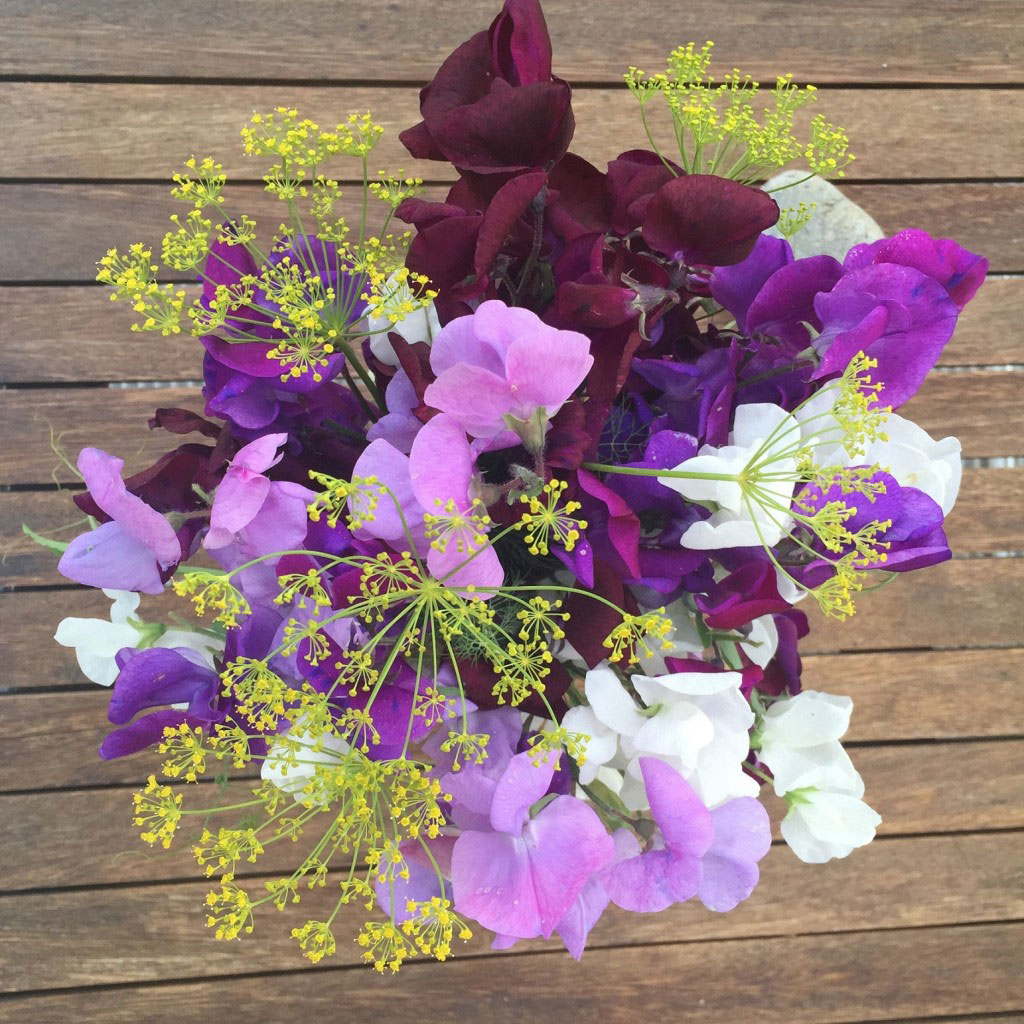 Krondill och en mix av luktärt i bukett. Luktärtsmixen i lila, violett och vitt på bilden heter ’Royal Mix’ och finns i Nelson Gardens sortiment.