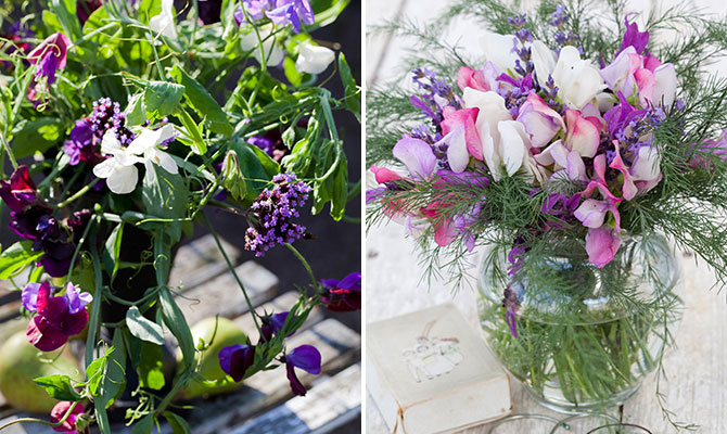 Till vänster: Yviga stora buketter gör man genom att klippa långa toppar. Dessa buketter blir väldigt gracila och levande. Passar kanske bäst att gör när man har extra mycket luktärtor.