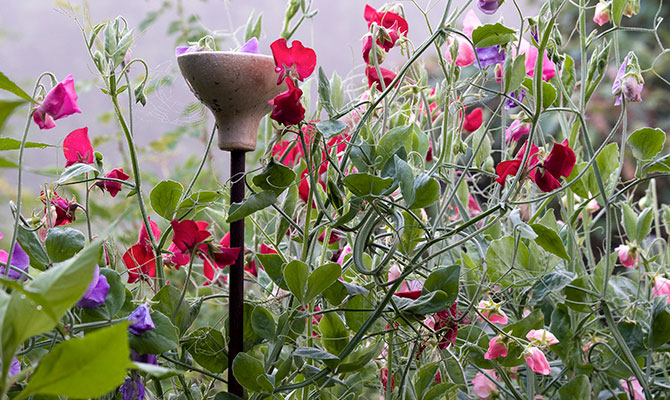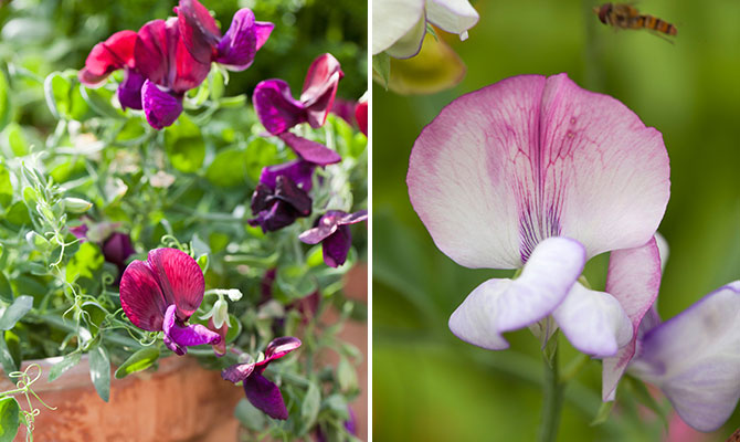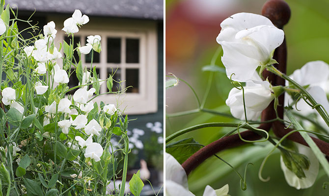 Till vänster: Ingen sommar utan klättrande doftande luktärtor. En kär mormorsblomma som blommar ända till frosten kommer. ’Royal White’. Till höger: Sätt stöd till dem från börja. Foto: Annika Christensen