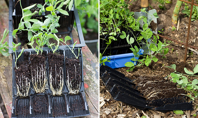 Till vänster: Så här fina rotsystem blir det i Roottrainern. Till höger: Glöm inte att avhärda dina luktärtor och plantera ut dem en molnig vindstilla dag. Avhärda betyder att man vänjer dem vid uteklimatet i några dagar genom att lyfta dem ut och in. Det starka soljuset och vinden kan ställa till det för de skira plantorna. Foto: Annika Christensen