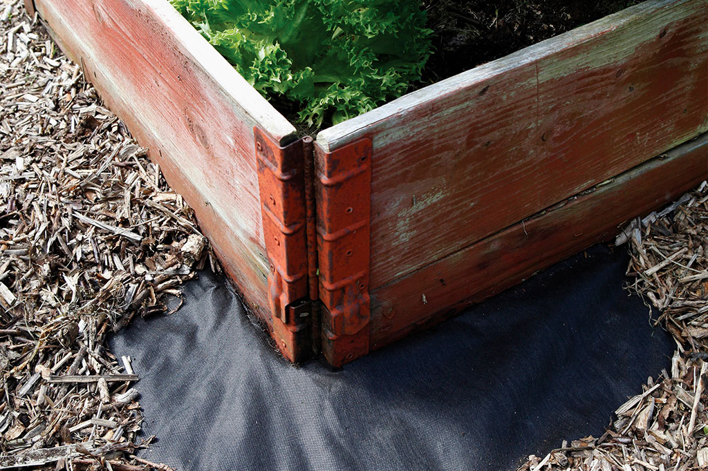 Det finns olika sätt att använda barkduk för pallkrage. Låt duken löpa upp längsmed sidorna för att förhindra att jorden trillar ut eller – som på bilden – låt den ligga under hela odlingen för att hålla gångarna ogräsfria. Foto: Annika Christensen