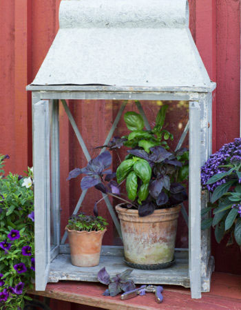 Att ställa in basilikakrukan i exempelvis en gammal fin lykta är ett bra sätt att ge basilikan det vindskydd som den behöver för att trivas riktigt bra. Foto: Annika Christensen för Nelson Garden