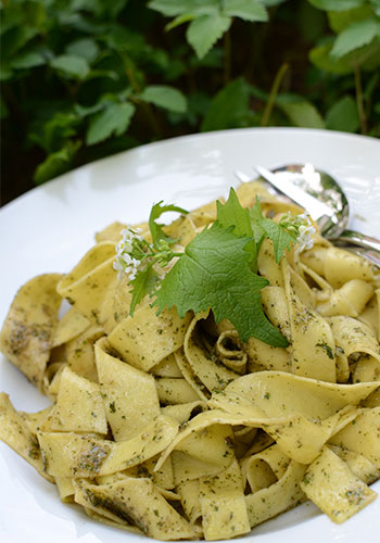 Bakom vårt hyreshus finns ett hav med kirskål, men som tur är håller sig kirskålen enbart där. Vi har länge varit intresserade av att prova att göra något med detta ätbara ogräs. Så en dag plockade vi av de skrynkligaste bladknopparna och gjorde en pesto av dem. Istället för vitlök kan man använda ogräset löktrav.