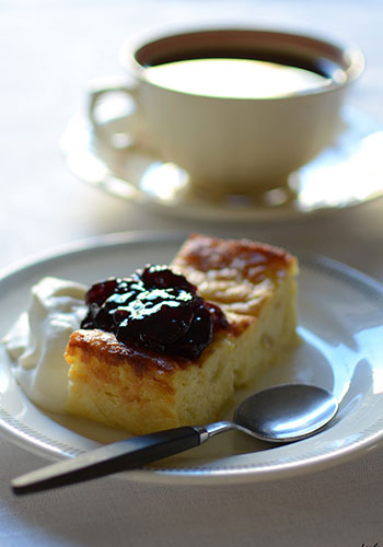 En god krämig ostkaka som passar lika bra till kaffet som till efterrätt, här serverad med vispad bräde och hemkokt körsbärssylt.