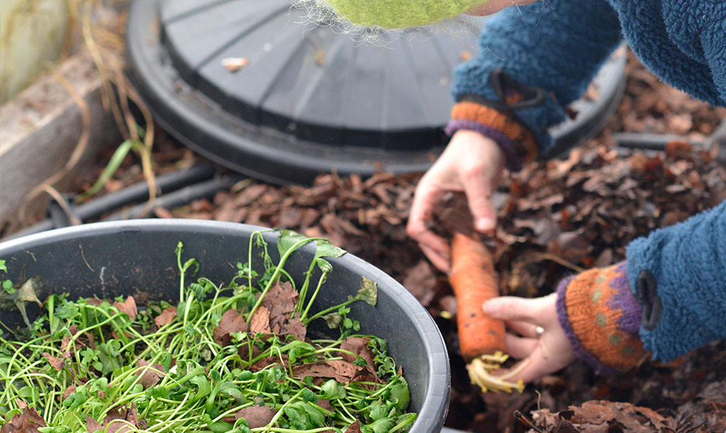 För att kunna lagra alla rotsaker som kålrot och morot, har Sara grävt en stuka i ett av sina tunnelväxthus. Det är helt enkelt en grop i marken som fylls med löv och, såklart, rotsaker! Foto: Markus Danielsson