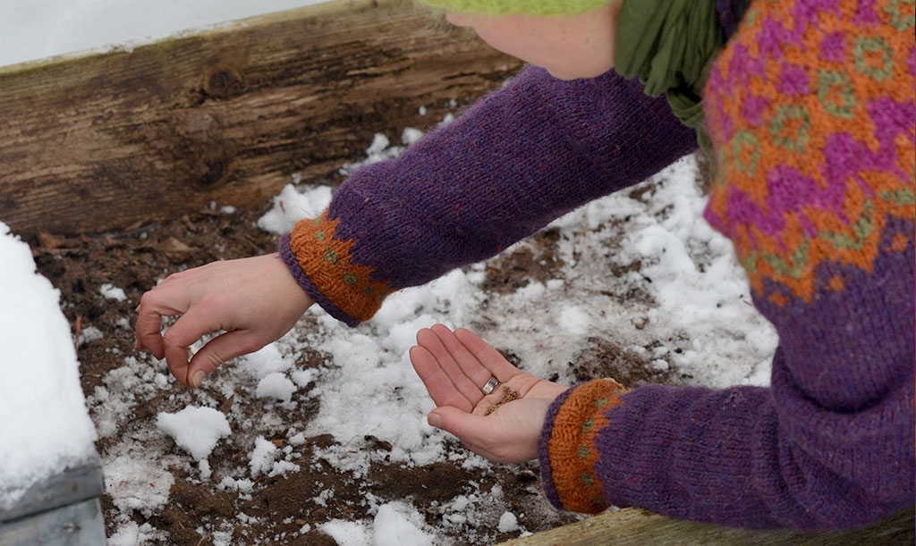 På den frusna jorden kan du så exempelvis grönkål, sallat och dill. Täck med ett tunt lager jord och invänta våren! Foto: Markus Danielsson