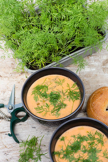 Ta av grytan från spisen, klipp ner dill och rör om. Spar lite dill så att det finns lite att klippa över soppan vid servering.