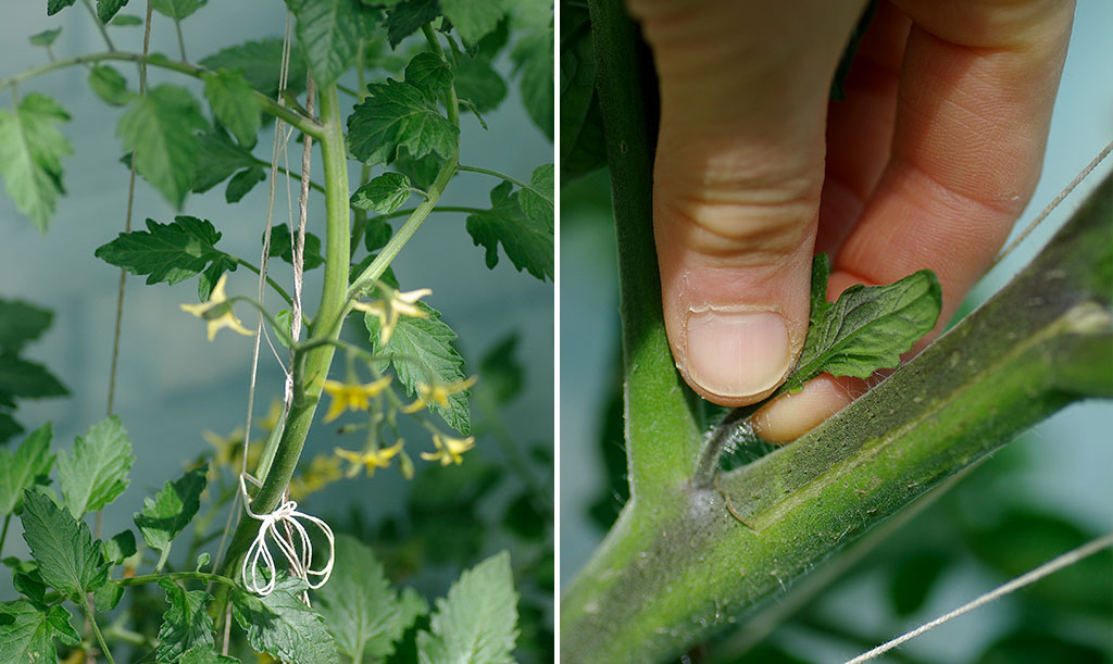 Vissa tomater sätter nya skott i grenvecken, vilket såklart kräver värdefull energi som annars skulle gått till att bilda tomater. Dessa skott behöver nypas bort (tjuvas) för att plantan ska ge så stor skörd som möjligt. Det står på fröpåsen om din sort är en sådan. Du behöver tjuva hela odlingssäsongen.