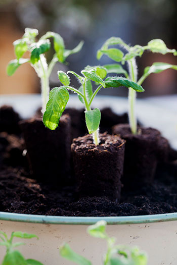 4. Plantera om dina tomatplantor när det andra bladparet – de första tomatbladsformade bladen – vuxit fram. Det brukar ta omkring tre veckor. Använd blomjord och små krukor. Sätt plantan så djupt i den nya krukan att de första bladen är precis ovanför jorden. Tomater kan bilda rötter utefter stammen och genom att sätta plantan djupt utvecklas rotsystemet bättre. Omkring två veckor efter omplantering är det dags att börja ge näring. Här kan du läsa mer om att ge näring till sina grönsaker.